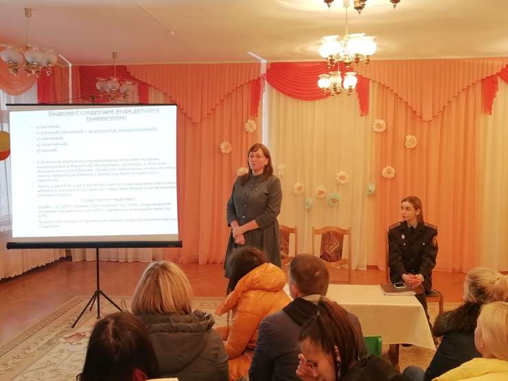 На собрание приглашены: Петрова Марина Николаевна, заведующий педиатрическим отделением по медицинскому обеспечению детей в учреждениях образования, филиала №4 ГЦГДКП и Бондаренко Анна Дмитриевна, инспектор ИДН ЖОВД г. Гомеля. В своем выступлении, которое сопровождалось демонстрацией видео, Петрова М.Н. акцентировала внимание родителей на факторах, представляющих угрозу жизни и здоровья детей в быту и необходимых действиях в оказании первой медицинской помощи в случаях травмирования. А.Н. Бондаренко проинформировала родителей о необходимости ответственного отношения к исполнению родительских обязанностей по воспитанию и содержанию несовершеннолетних, а также мерах административной и уголовной ответственности в случае их ненадлежащего исполнения.